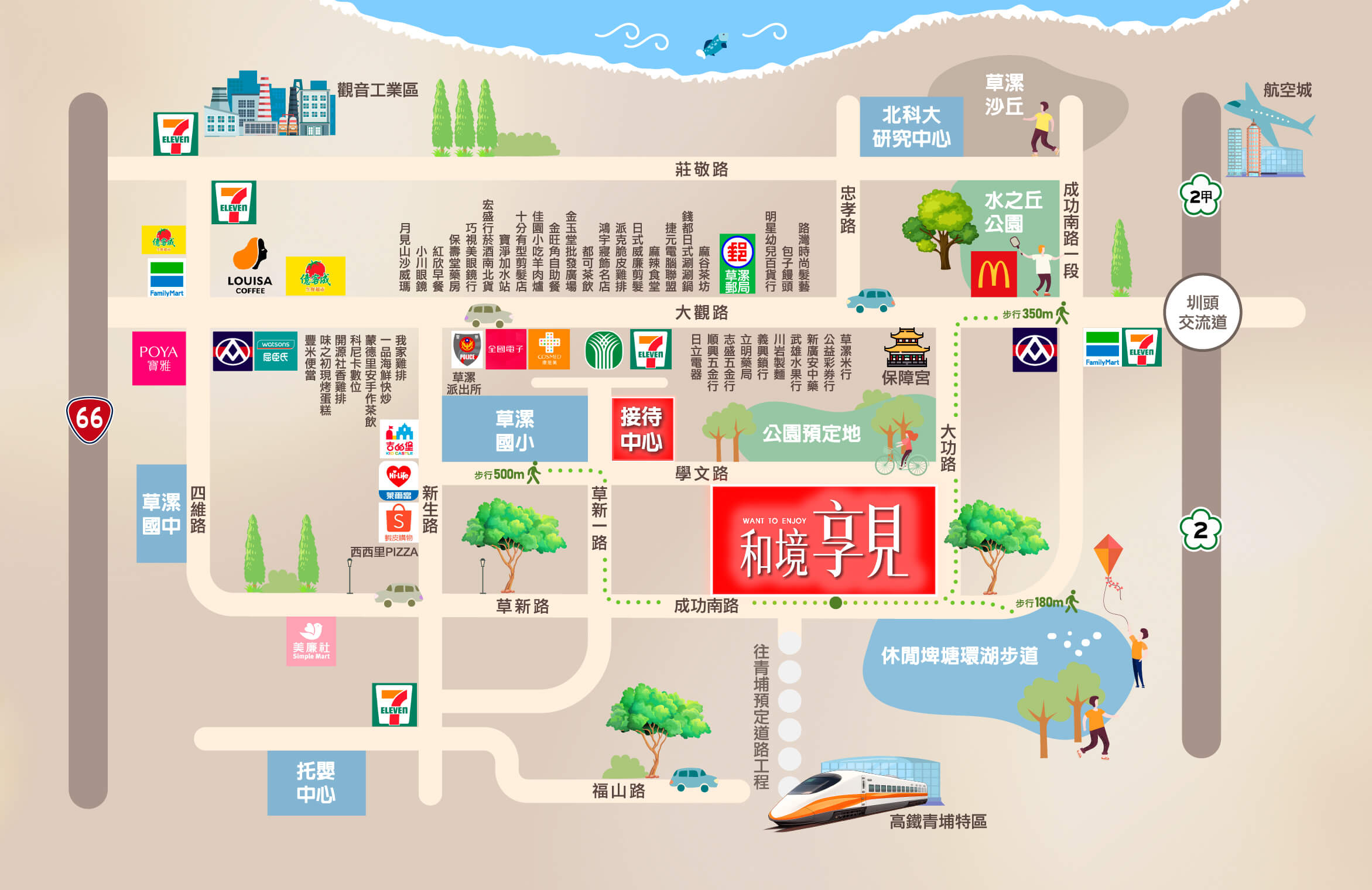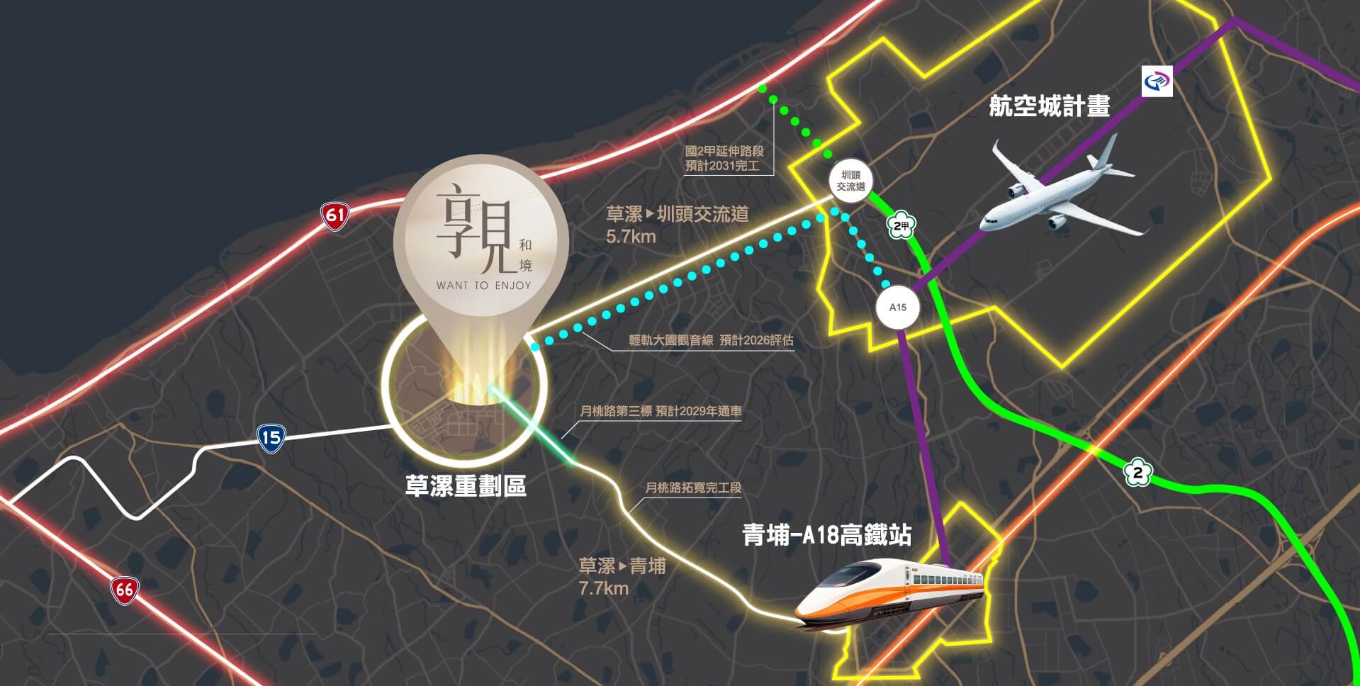 航城三大區塊串連產業、交通與宜居;六大聯外動線則以國道、快速道路與捷運延伸交通半徑,形成高效率的通勤網路。從草漯出發,不論南來北往。都能在最短時間接軌機場、高鐵與青埔都會中心。正因具備稀有的交通便捷度,加上腹地完整、區域穩定發展,草漯成為近年置產族與新興家庭最關注的成長板塊,具備穩定增值的前瞻條件。