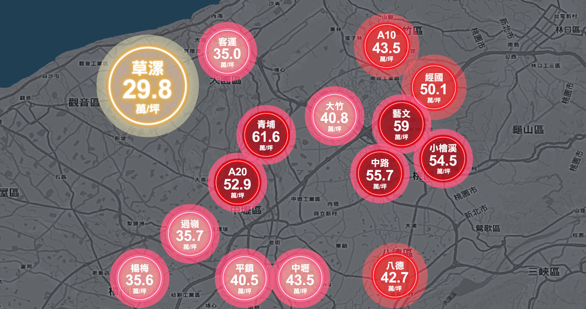 桃園西部隨著核心城市的蓬勃發展,促使周遭衛星城市在溢出效應的加持下逐步啟程,在整體房價結構上,因航空城計畫而孕育出以青埔特區作為核心重劃區,帶動了包含草漯、客運等因應未來航空城發展所布局的衛星城市。